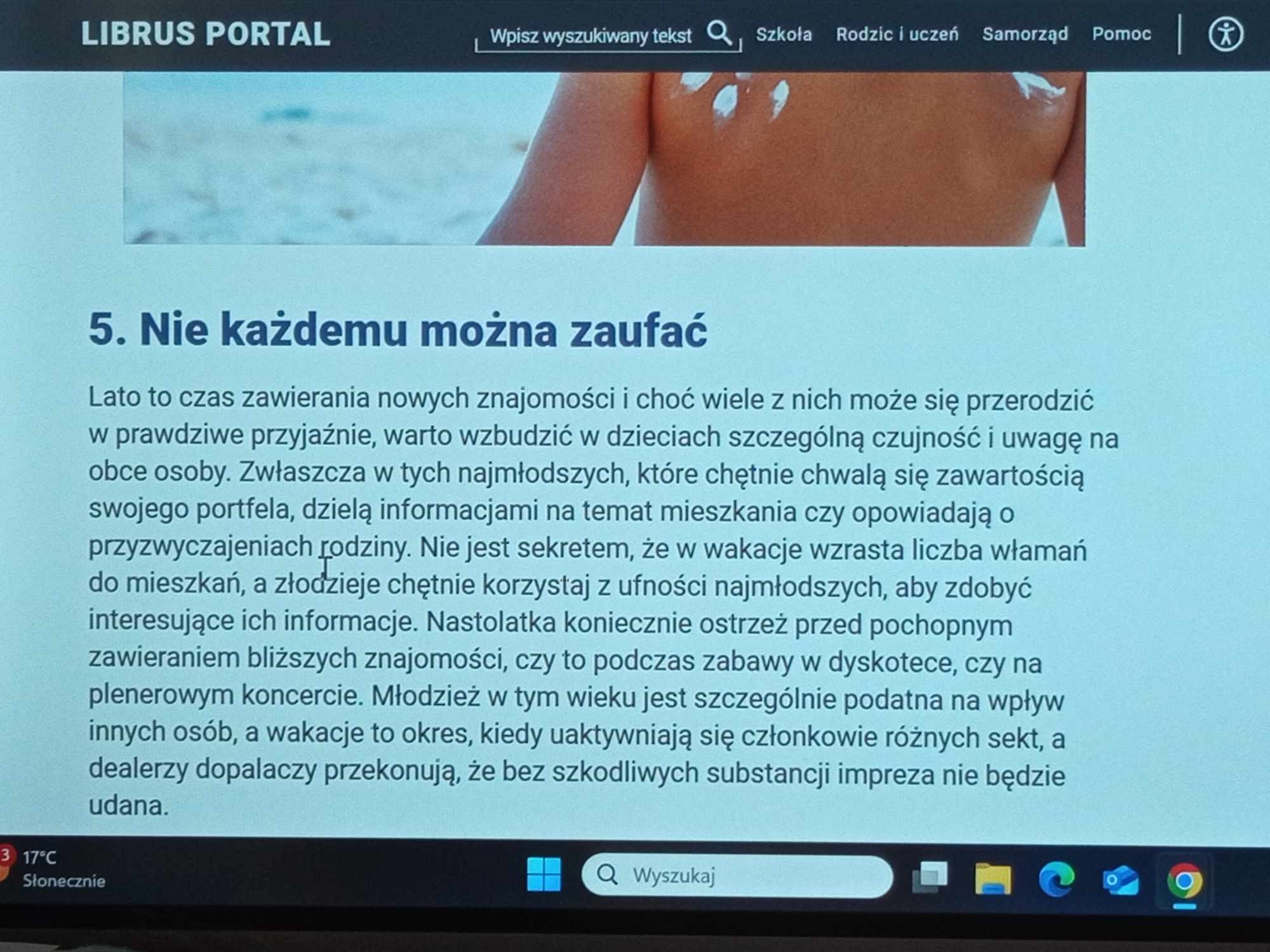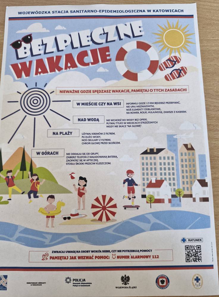 Pod takim hasłem realizowaliśmy zalecenia ministerialnego programu dotyczącego bezpiecznych wakacji: dopalacze, papierosy i wszelkie używki, samodzielny pobyt w domu, kontakt z obcymi osobami i zwierzętami, bezpieczeństwo w uczestnictwo w ruchu drogowym i przede wszystkim jazda na hulajnodze… Uczniowie zostali posłani na wakacje bogatsi o wiedzę, która może być pomocna w trudnych sytuacjach.