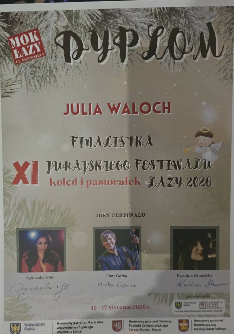 Uwaga!!! Opublikowano w dniu 16 stycznia 2026 Autor: Admin Kibicujemy Julii Waloch, która kolejny raz bierze udział w festiwalu kolęd, tym razem w Łazach. Gratulujemy udziału i życzymy miejsca na podium