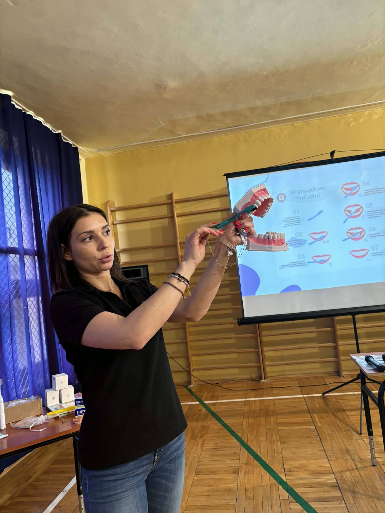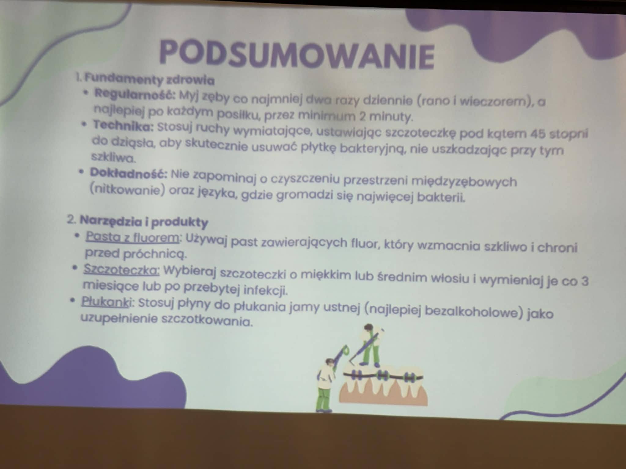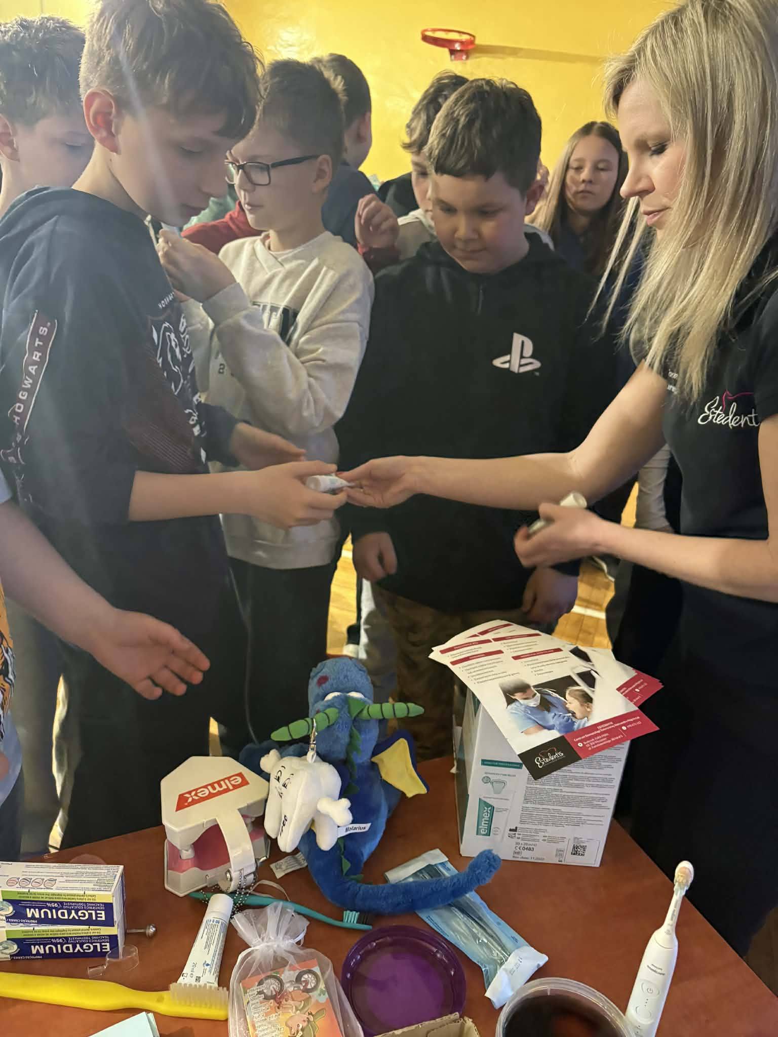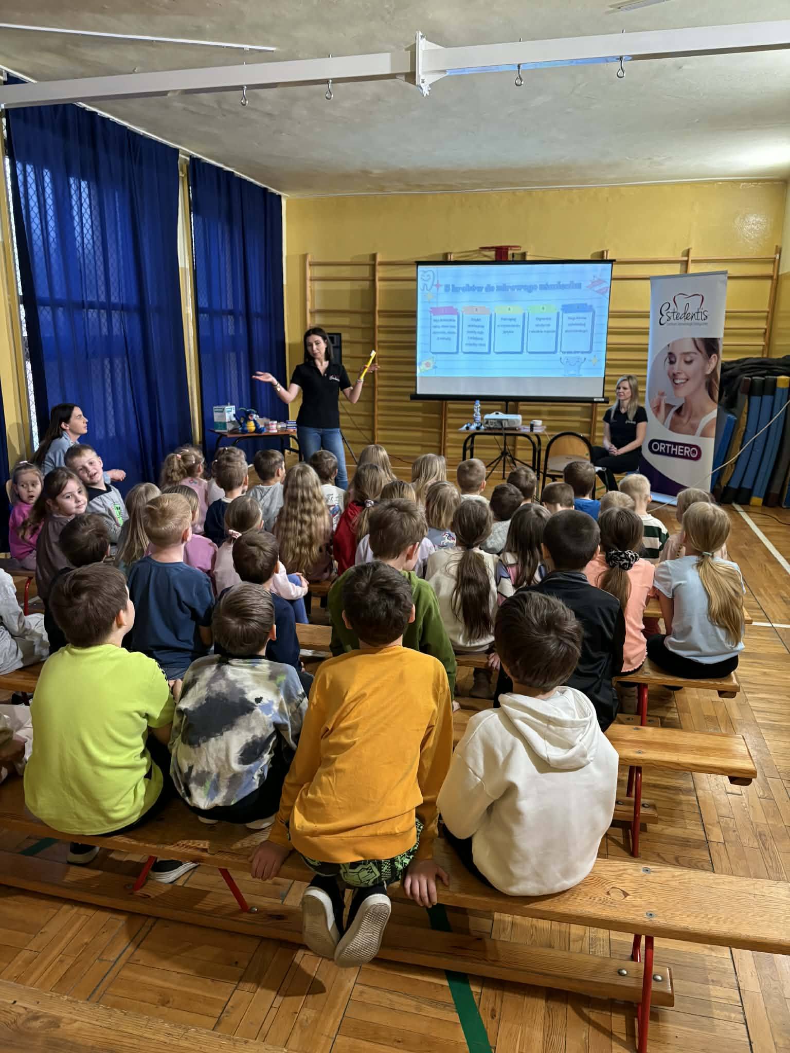 W środę 15 kwietnia odbyły się w naszej szkole warsztaty stomatologiczne poprowadzone przez panie: Paulinę Zbirek- Chwist, Roksanę Słabosz oraz Paulinę Partykę – Piwek. Panie przyjechały do nas z Myszkowa z gabinetu Estedentis. Warsztaty miały na celu zachęcenie do codziennej , świadomej pielęgnacji zębów i oswojenie uczniów z tematyką wizyt w gabinecie stomatologicznym. Dzieci dowiedziały się co jest fundamentem zdrowia czyli: regularność, technika i dokładność. Uczniowie poznali narzędzia i produkty niezbędne dla utrzymania odpowiedniej higieny jamy ustnej. Chętnie zadawali pytania i otrzymali wyczerpujące odpowiedzi. Zrozumieli, iż dobre zdrowie prowadzi do spełniania swoich marzeń.